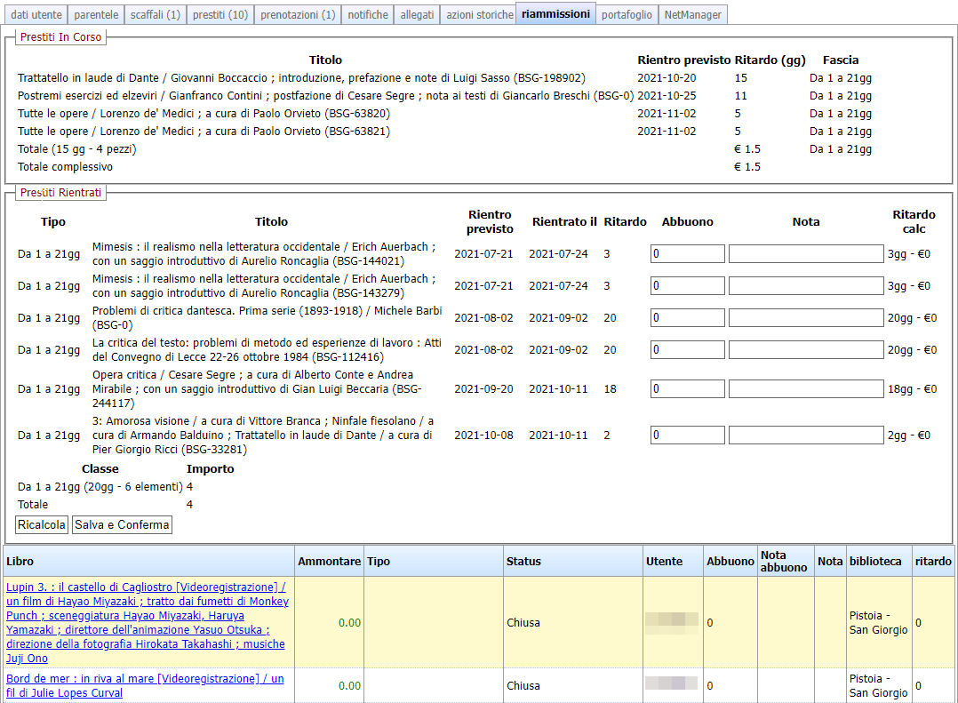 Prestiti Rientrati elenca i documenti già rientrati, ma con un ritardo accumulato e le relative sanzioni provvisoriamente fissate.
