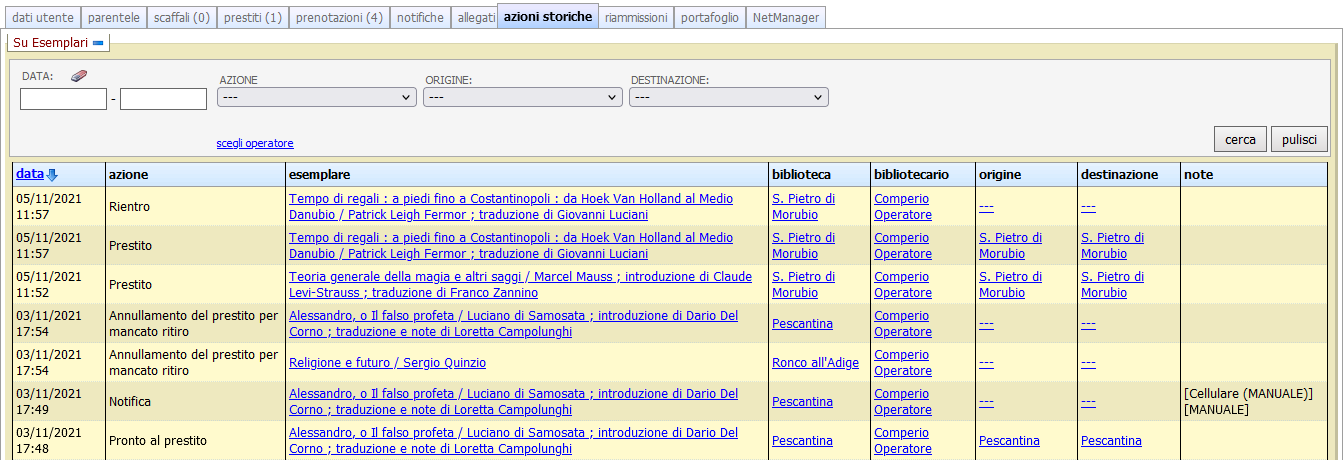 La sezione Su esemplari riporta il registro di tutte le operazioni di circolazione collegate all’utente: viene indicata la data in cui l'operazione è stata effettuata, il tipo di azione, il titolo dell'esemplare movimentato, la biblioteca e l'operatore che ha eseguito l'azione, la biblioteca di origine e quella di destinazione dell’operazione, eventuali note (ad es. nel caso di notifiche o solleciti, viene visualizzato il canale di comunicazione).