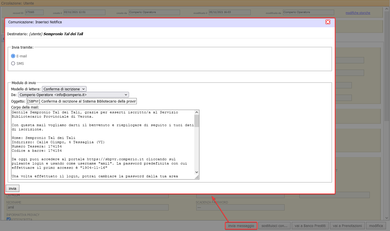 Cliccando il pulsante invia messaggio viene aperta una finestra popup da cui è possibile inviare un'email o un sms all'utente. È necessario selezionare dal menu a tendina il modello di lettera da inviare, il mittente, e infine cliccare il pulsante invia.