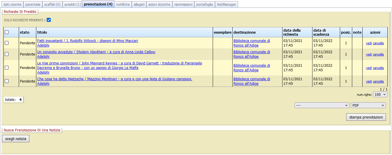 Apre la pagina Prenotazioni con l'elenco delle prenotazioni soddisfacibili per l’utente dalla biblioteca attuale.