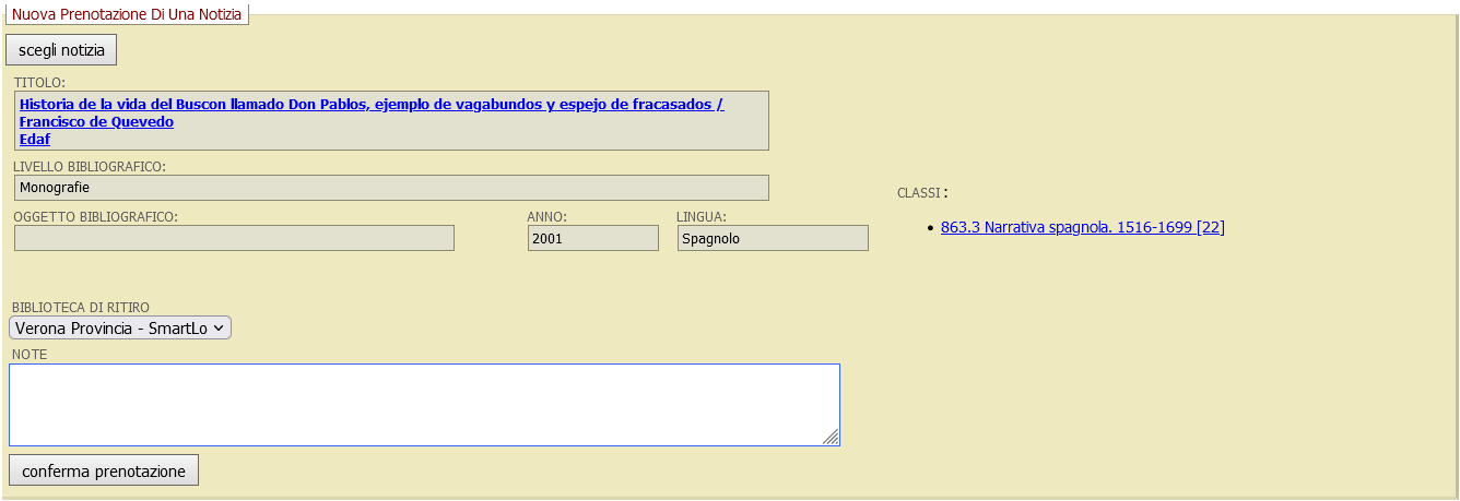 Cliccando sul pulsante Scegli notizia si apre una finestra per la ricerca di notizie; una volta individuata la notizia che interessa, cliccare sul link lega. Scegliere la biblioteca di ritiro, se diversa da quella in cui si sta facendo l'operazione, e cliccare sul pulsante Conferma prenotazione.