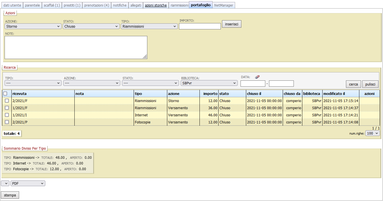 Nella tabella riassuntiva della sezione Ricerca, è possibile visualizzare tutte le operazioni storiche effettuate o filtrare per Tipo, Azione, Stato, Biblioteca e Data. Le informazioni riportate per ogni singola operazione sono, oltre ai già citati parametri di filtro, il numero di ricevuta, le eventuali note, l’importo, e il nome dell’operatore che ha compiuto l’azione.