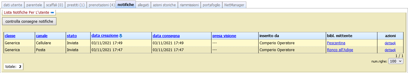 La tabella organizza le notifiche in base alla Classe, il canale di comunicazione, Data creazione e Data consegna, la Presa visione della notifica da parte dell’utente (disponibile solo per quei canali di comunicazione che permettono di registrare automaticamente questa informazione), il nome dell’operatore che ha effettuato la notifica e la biblioteca mittente.