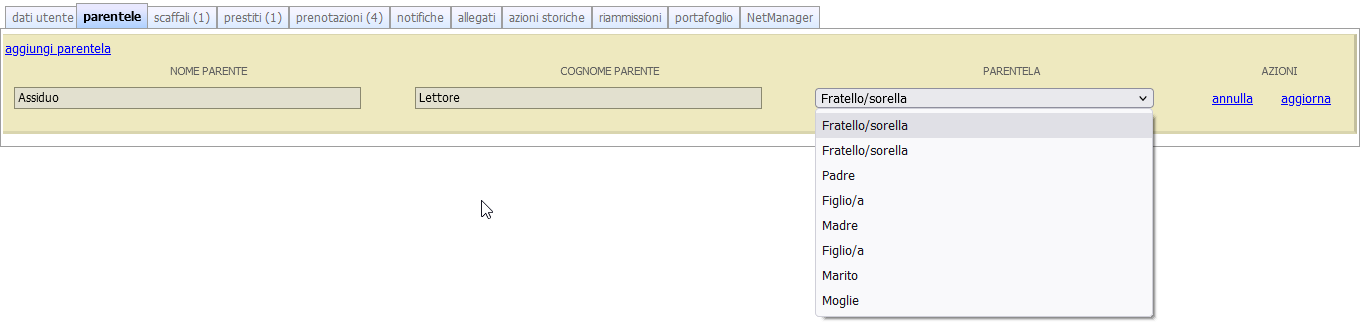 Cliccando il link Aggiungi parentela è possibile ricercare e selezionare altri utenti che hanno rapporti di parentela con l'utente della scheda, selezionando il tipo di rapporto e quindi cliccando il link aggiorna sulla destra.