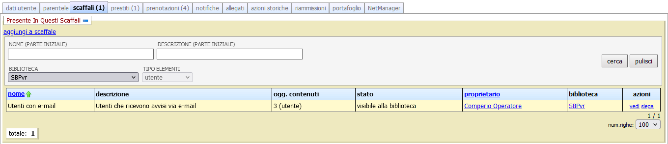 Nella tabella vengono visualizzate le informazioni identificative di ogni singolo scaffale, ovvero il Nome e la Descrizione, il numero totale degli oggetti contenuti (utenti) al suo interno, lo Stato di visibilità, il proprietario, ovvero l’operatore che ha creato lo scaffale, la biblioteca che gestisce lo scaffale.