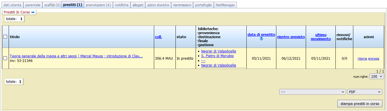 Sotto alla tabella è possibile ottenere la stampa dei prestiti in corso per l'utente, selezionando un modello di stampa e cliccando il pulsante Stampa prestiti in corso.