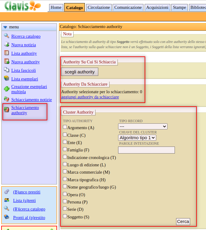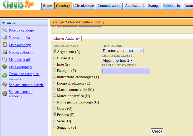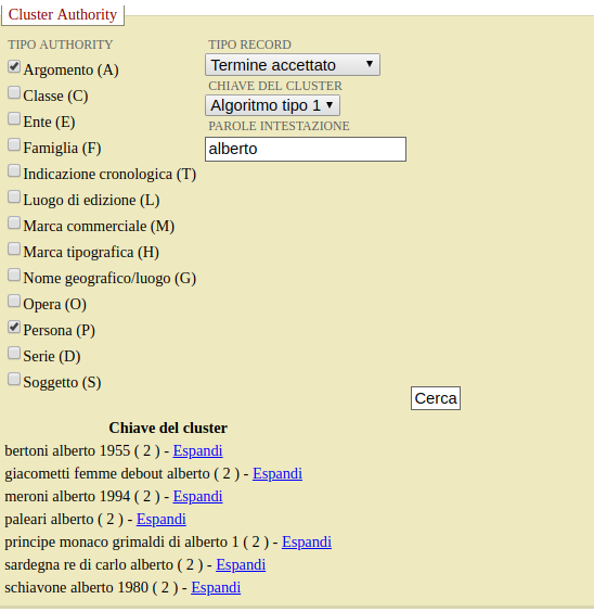 Si inizia selezionando uno o più tipi di authority per i quali si vogliono vedere i cluster di elementi simili. A differenza della funzionalità di schiacciamento authority, qui è possibile agire anche su entità differenti, per esempio schiacciare argomenti e persone.