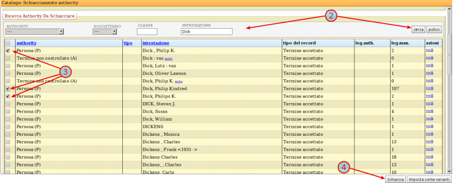 Nella colonna denominata corretta si sceglie la forma preferita dell'authority, poi si individuano le forme che si vogliono schiacciare o impostare come varianti selezionandole nella colonna chiamata duplicata. Infine si clicca sul pulsante schiaccia o imposta come varianti, a seconda del tipo di modifica che si vuole fare.