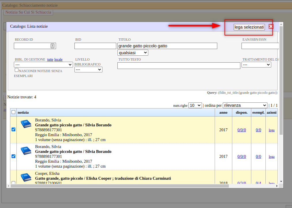 Una volta cliccato sul pulsante Scegli notizia, sarà sufficiente compiere una ricerca a catalogo utilizzando i consueti filtri di ricerca, quindi cliccare su lega.