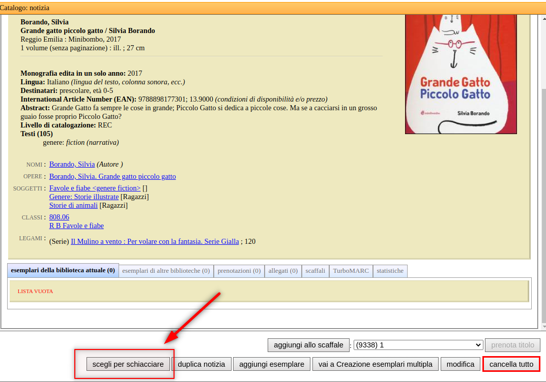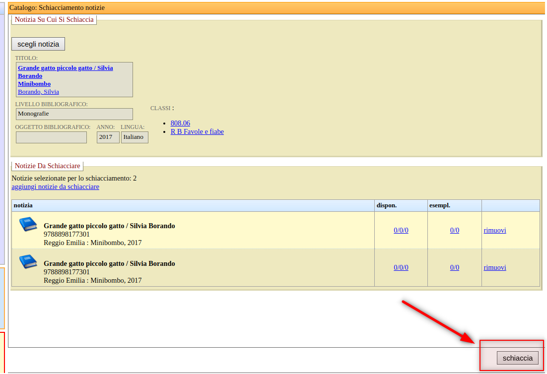 Innanzitutto è necessario selezionare da catalogo la notizia su cui si desidera effettuare lo schiacciamento, Notizia Su Cui Si Schiaccia, ovvero la notizia che verrà mantenuta nel catalogo.
