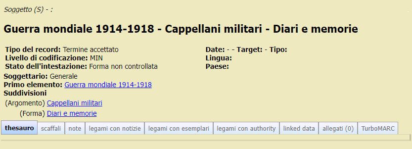forma: suddivisione formale, precisa la forma con cui il contenuto dell'oggetto bibliografico è presentato (es.: Diari e memorie, Manuali, ecc.)