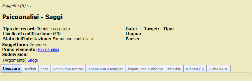 La correzione di un singola voce che costituisce il soggetto si effettua selezionando la voce dalla schermata di visualizzazione del soggetto. Ad esempio nel seguente esempio Psicoanalisi - Saggi si vuole correggere la voce Psicoanalisi in Psicanalisi.