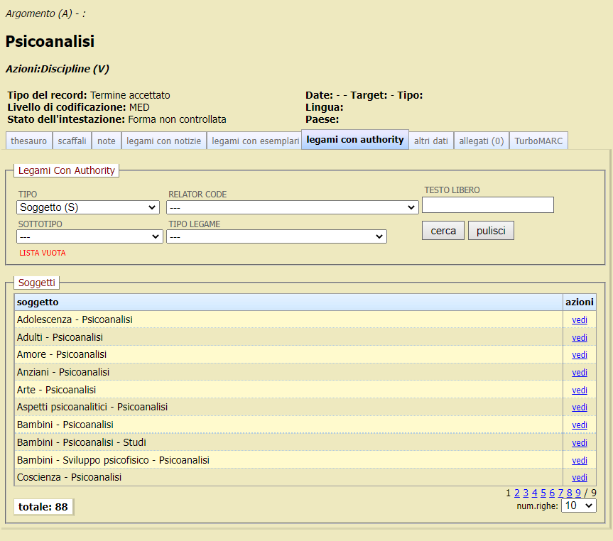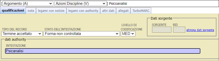 Dopo aver cliccato sulla voce che si vuole correggere, che in questo caso è il primo elemento (ma potrebbe ugualmente trattarsi di una suddivisione), si apre la schermata della voce Psicoanalisi, inserita nella lista di autorità come Argomento.
