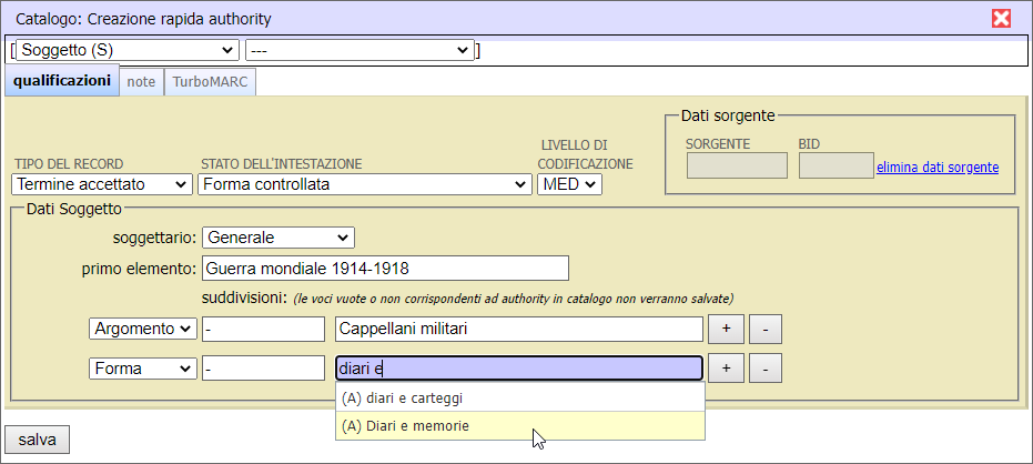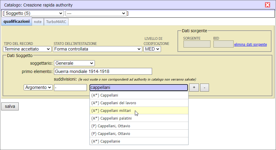 Se il Primo elemento ricercato non è presente in authority, lo si aggiunge cliccando il pulsante Crea.