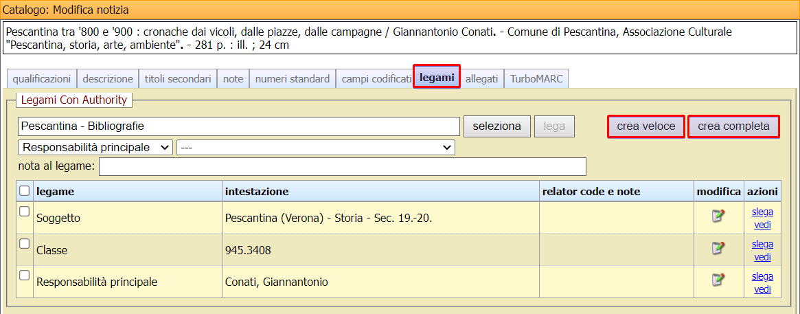 È possibile creare un soggetto dalla sezione Legami di una notizia. Dopo aver cercato il soggetto dal box di ricerca, se questo non è presente, cliccando Crea veloce si aprirà un pop up per la creazione della stringa, mentre cliccando Crea completa si aprirà la scheda completa che presenta le stesse funzionalità di Nuova authority.