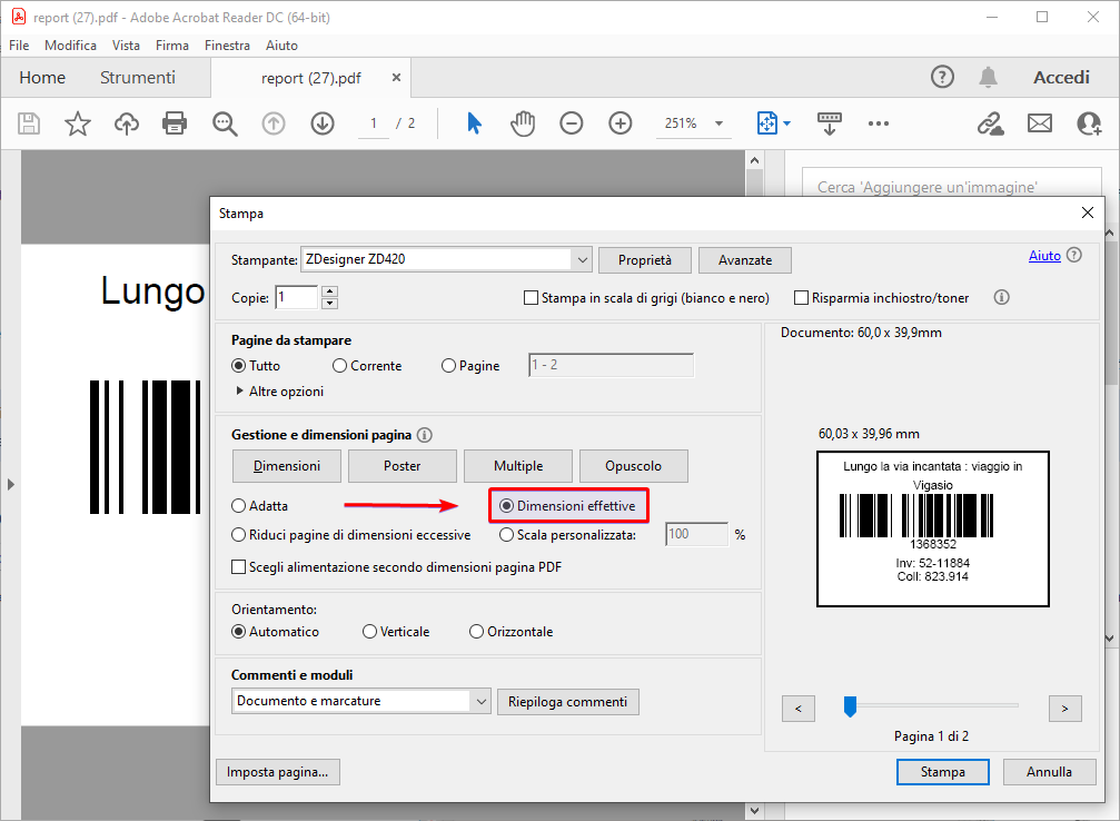 Nell'immagine è evidenziata la parte per la selezione della stampante (nel nostro caso una Zebra ZD420) e le parti della maschera di stampa di Adobe Acrobat Reader dove viene suggerito un eventuale ridimensionamento da parte del programma di stampa: si sceglie quindi solo l'opzione Dimensioni effettive.