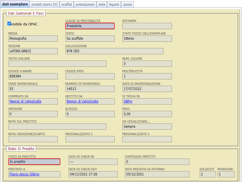 Una volta attivato l’automatismo, nel caso lo Stato di prestito dell’esemplare passi da In prestito a uno stato diverso (Non in prestito, Pronto al transito di rientro etc.), modifica automaticamente il campo Classe di prestabilità dell’esemplare in Non disponibile per un tempo definito e personalizzato da chi ne richiede l’attivazione (in base a specifiche regole di quarantena adottate).