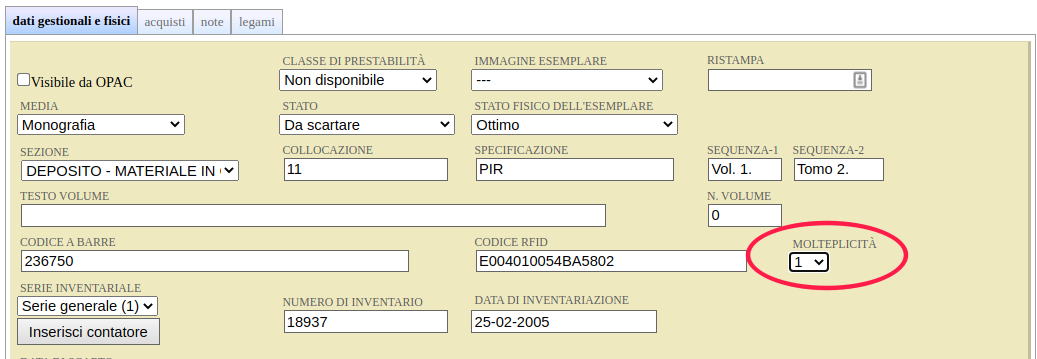Nei dati gestionali e fisici degli esemplari, il campo Molteplicità indica il numero di unità separate che formano una risorsa, per esempio: