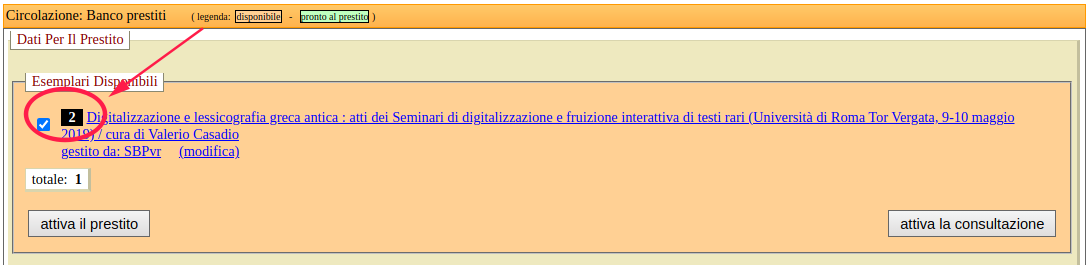 Il numero che compare nel menu a tendina indica il numero di parti che compongono l’esemplare. Questa informazione compare sia in fase di prestito che in fase di restituzione, e suggerisce al bibliotecario il numero di parti dell’oggetto per poter controllare che la risorsa sia intatta, in fase di prestito e anche di restituzione.
