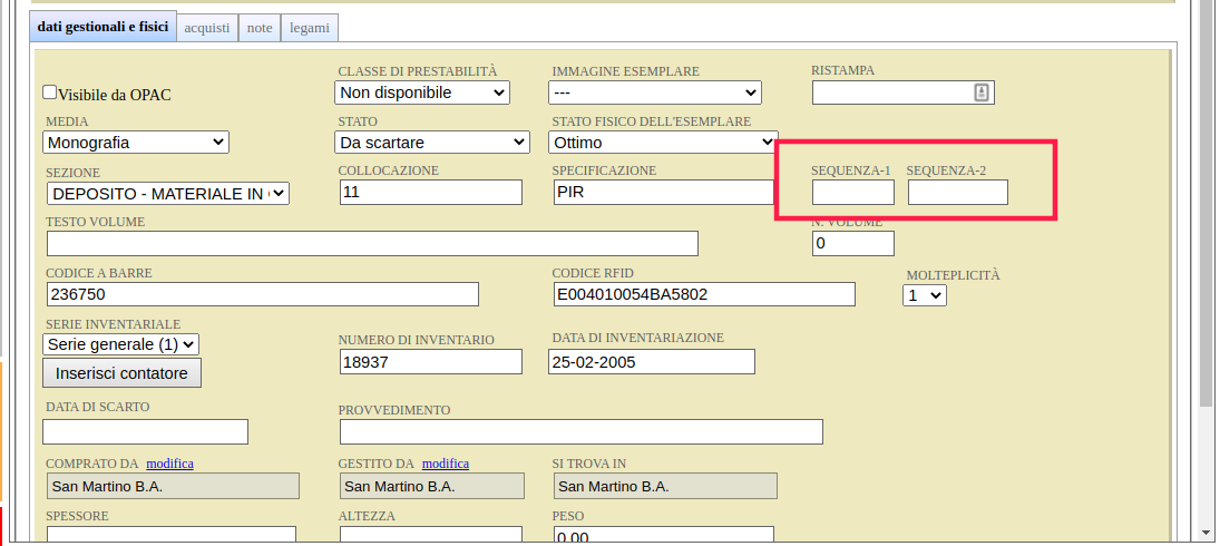 Il campo Sequenza 1 serve per specificare il numero del volume relativo a quell’esemplare, per esempio Vol. 1 o Vol. 2.