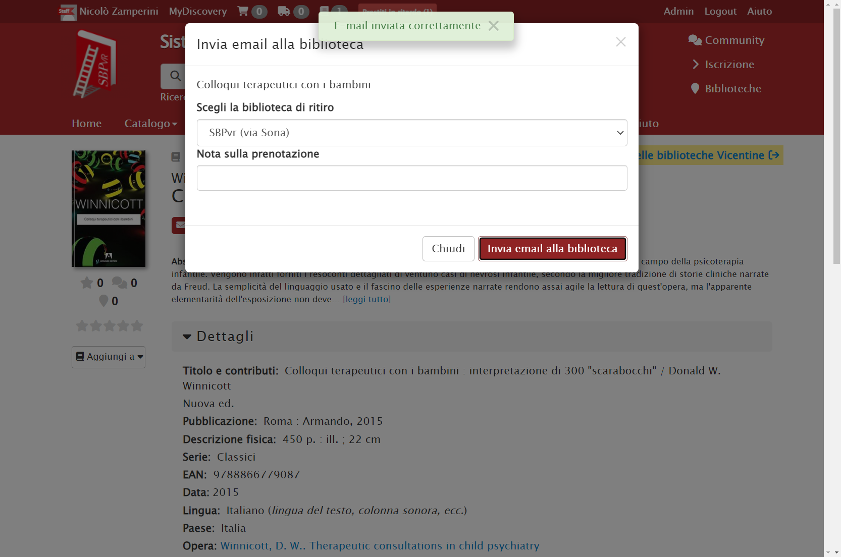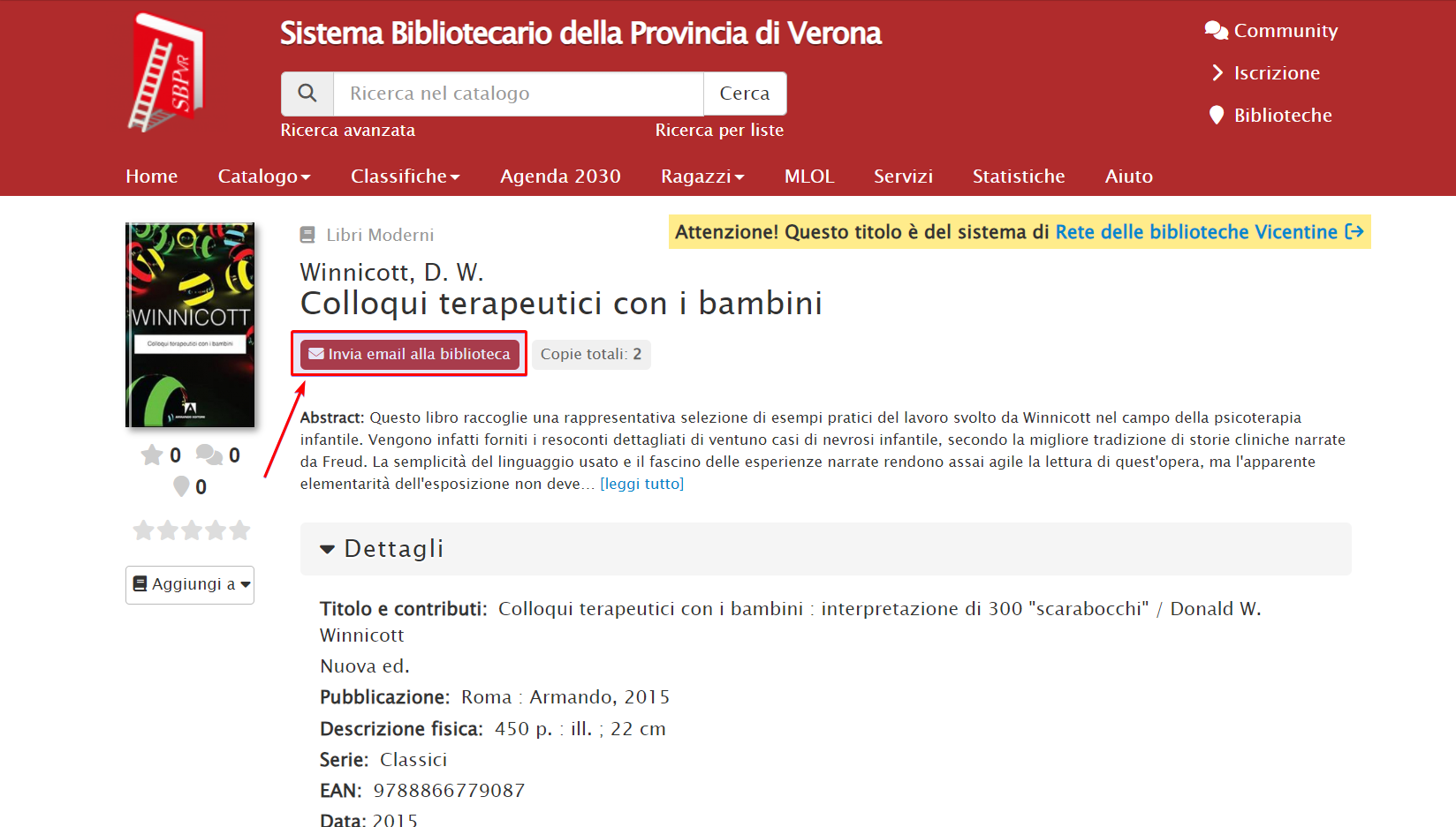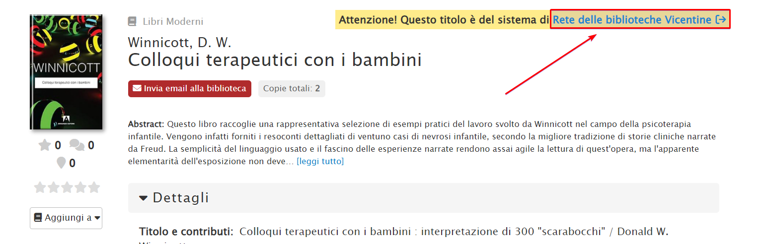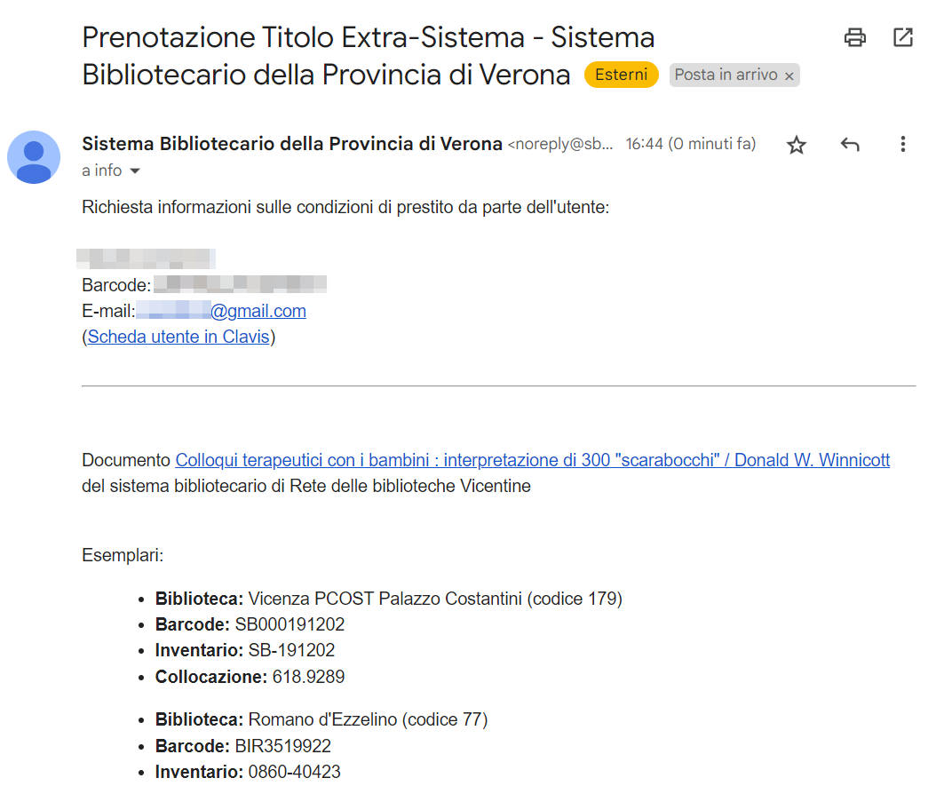 La biblioteca che riceve una mail di richiesta esterna (→ Romano d’Ezzelino), per completare la procedura e inviare il libro Colloqui terapeutici con i bambini: