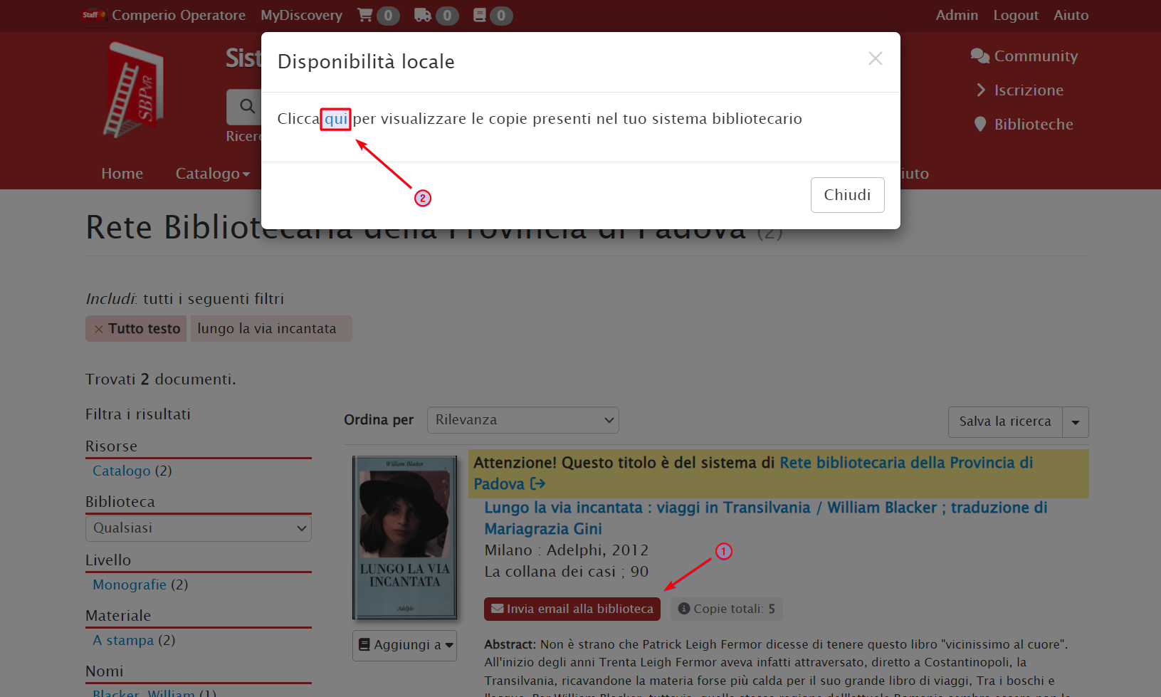 2. Cliccando sui link della mail, controlla lo stato dell’utente e del documento sull’OPAC di origine
