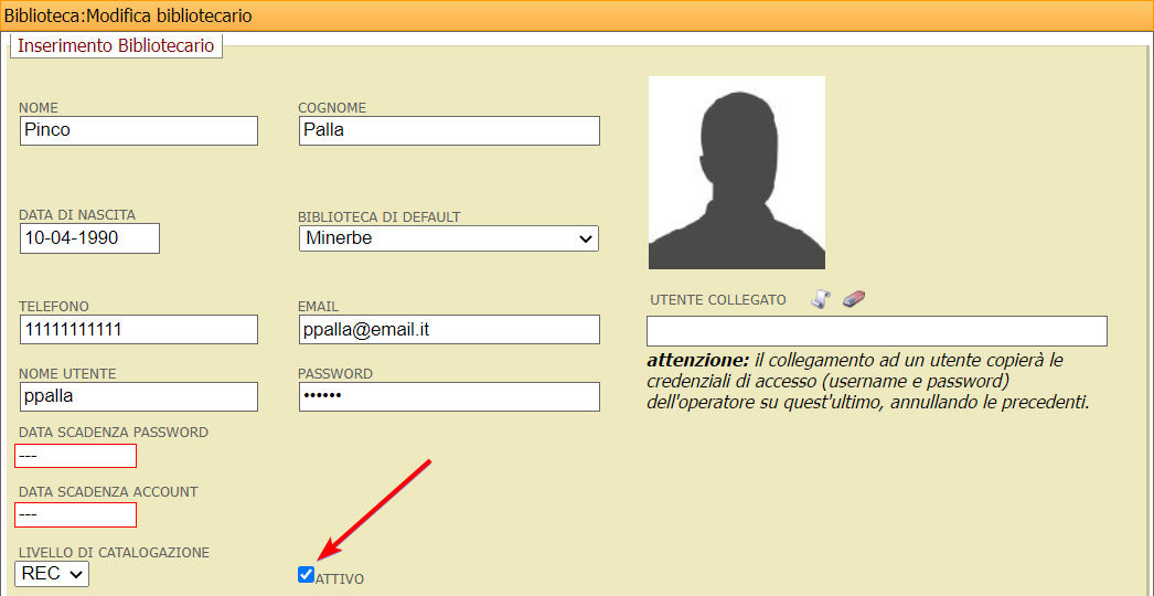 Cliccare Inserisci operatore nell’area Biblioteche e completare le informazioni anagrafiche del nuovo operatore.
