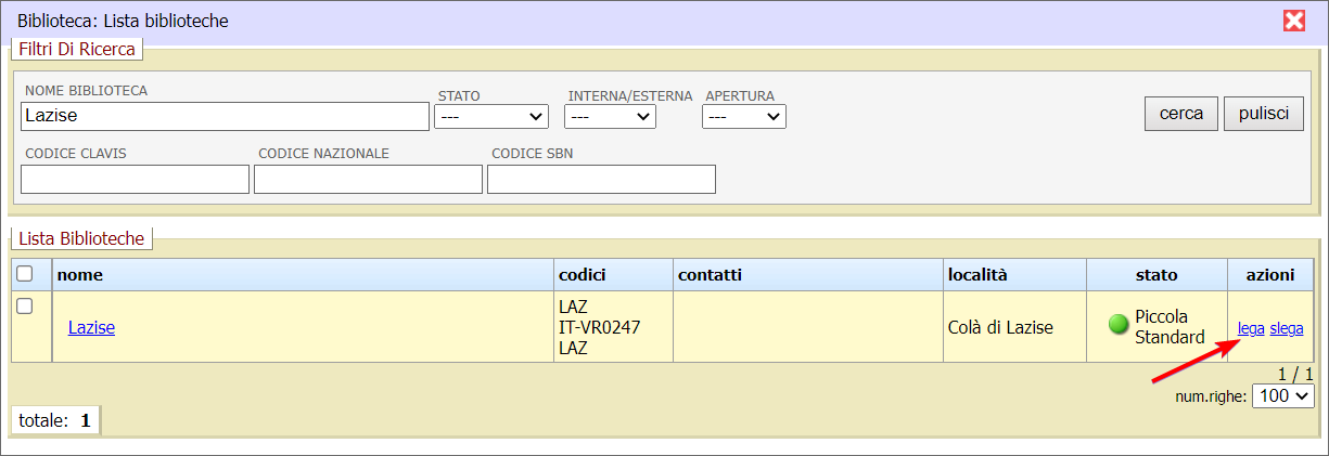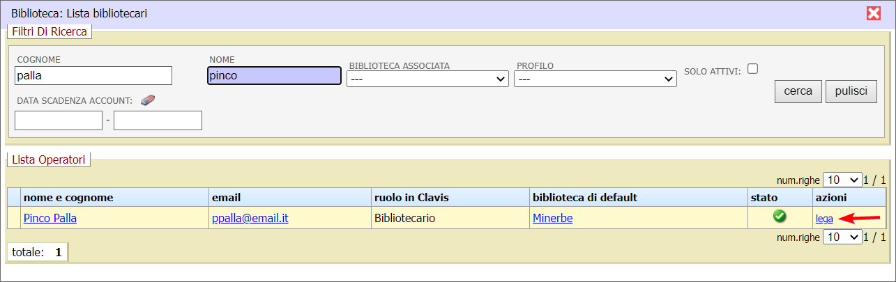 Nella finestra popup che si apre, individuare l’operatore da legare alla biblioteca e cliccare sull’azione lega.