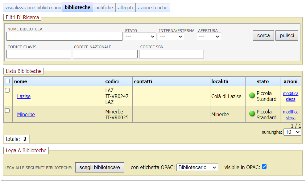 Cliccando il pulsante scegli biblioteca/e si apre un popup di scelta della biblioteca; una volta individuata e selezionata (o selezionate se si intende legare l’operatore a più biblioteche), cliccare sull’azione lega.