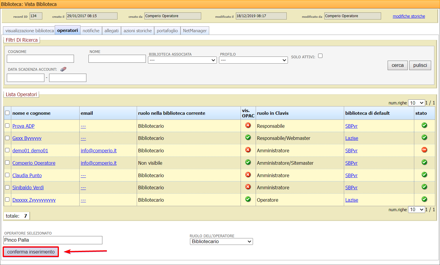 L’operatore viene visualizzato nella sezione precedente, dove, dopo aver scelto eventualmente il ruolo nel menu a tendina ruolo dell’operatore, può essere infine convalidato cliccando il pulsante Conferma inserimento.