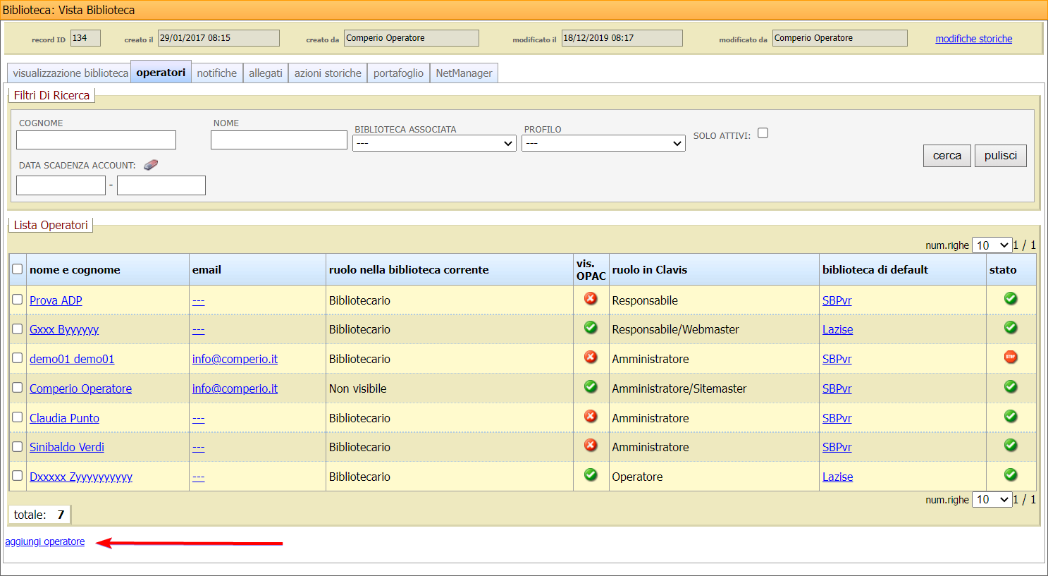 Dalla Scheda di dettaglio biblioteca, all’interno della sezione operatori, cliccare il link aggiungi operatore sotto alla Lista operatori.