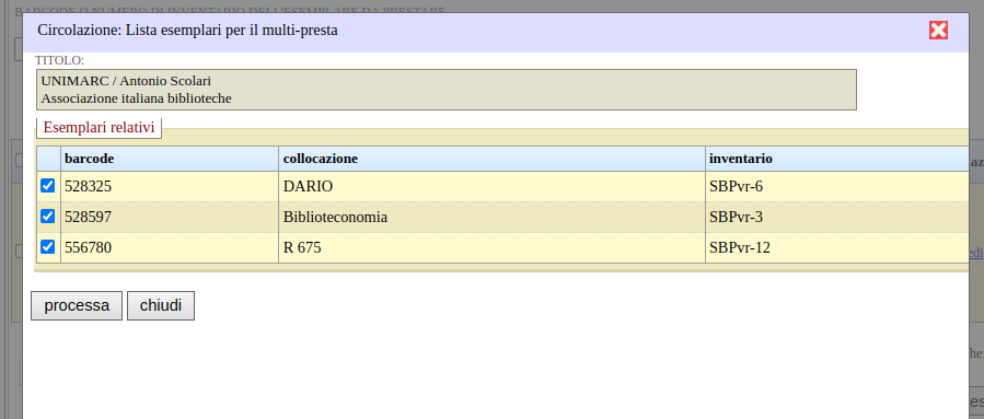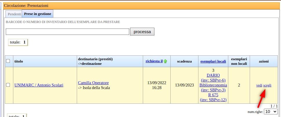il bibliotecario prende in gestione la prenotazione, clicca su Scegli e spunta tutti gli esemplari relativi alle diverse unità prima di processarli.