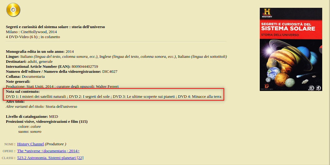 una nota di contenuto, indicizzata dal sistema con lo stesso peso di un titolo vero e proprio. Quando si indica in una nota di contenuto il titolo specifico di un film l’utente che lo cercherà arriverà a quella notizia, pur avendo quella notizia un altro titolo;