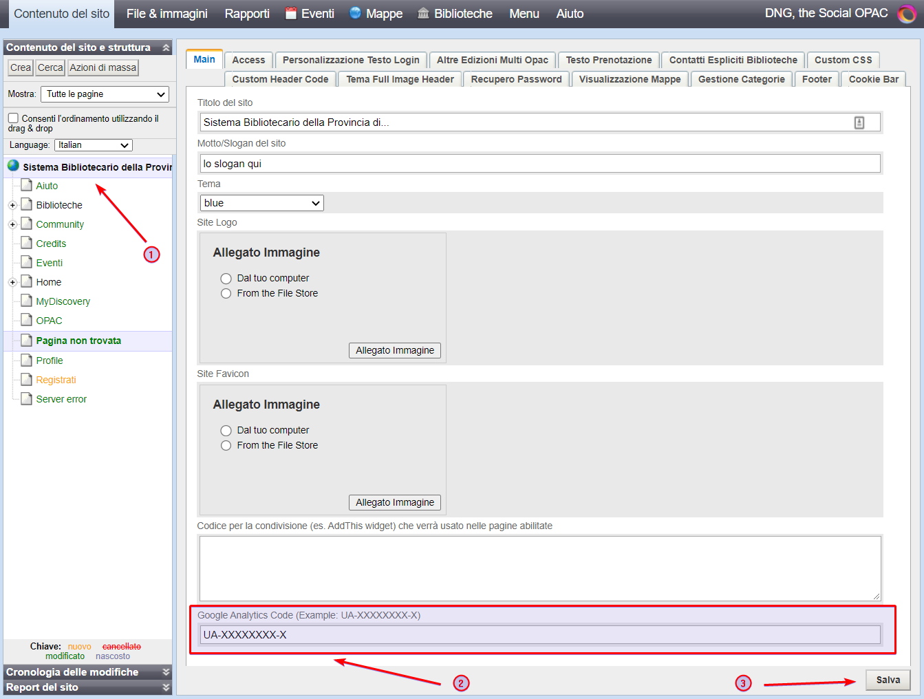 cancellare il codice presente nel campo Google Analytics Code;