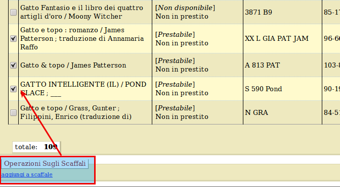 Dall'elenco risultante selezionare gli esemplari da scartare; per inserirli nello scaffale di scarto, premere aggiungi a scaffale, sotto all’elenco.