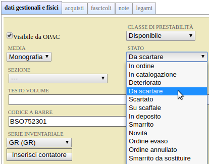 Quando si trova un esemplare da scartare, invece di inserirlo nello scaffale di scarto occorre modificare la sua scheda cambiando lo stato in Da scartare.