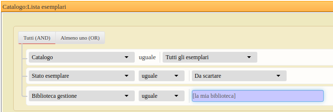 Si procede allo stesso modo per tutti gli esemplari che vanno scartati. Quando si procede al loro scarto, iniziare come indicato sopra al punto 1, creando lo scaffale di scarto, quindi inserire gli esemplari a partire da una ricerca della Lista esemplari indicando lo Stato esemplare uguale a Da scartare.