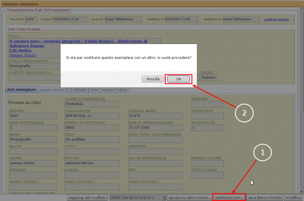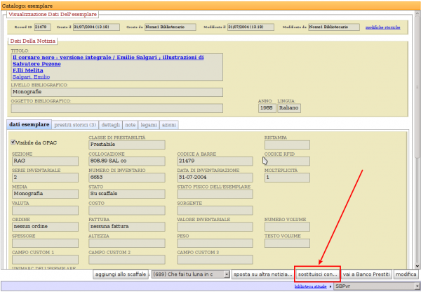 La scheda aperta si riferisce all'esemplare da sostituire, mentre l'esemplare che andremo a cercare sarà l'esemplare corretto su cui si schiaccia.