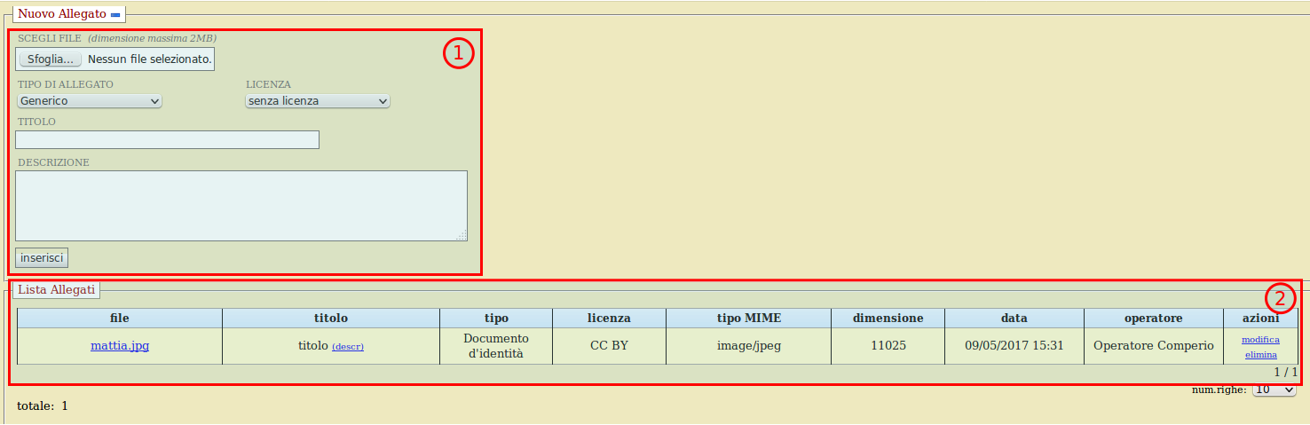 La sezione Allegati della pagina si presenta a questo punto divisa in due parti: