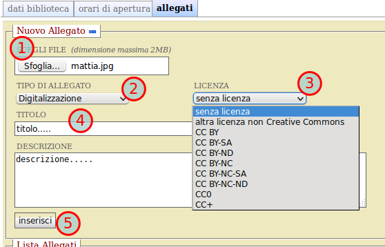 Quindi è necessario specificare un titolo per l'allegato, che permetterà poi di individuarne subito il contenuto nelle liste riepilogative (4). É anche possibile aggiungere una descrizione più estesa del contenuto dell'allegato.