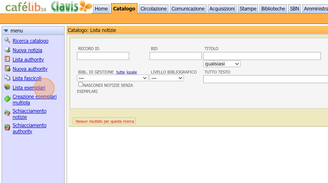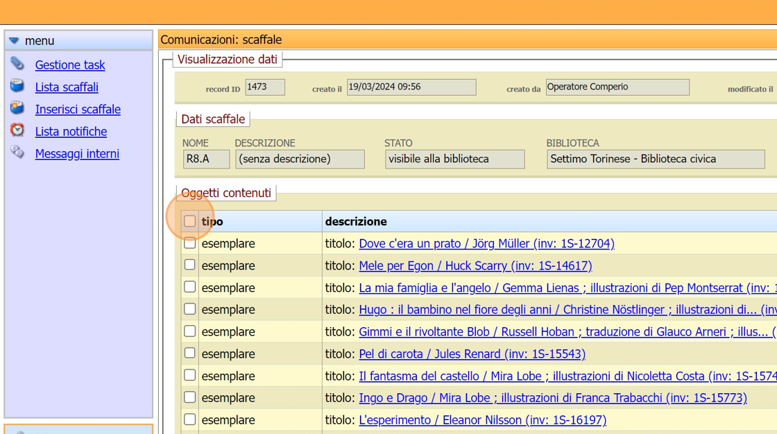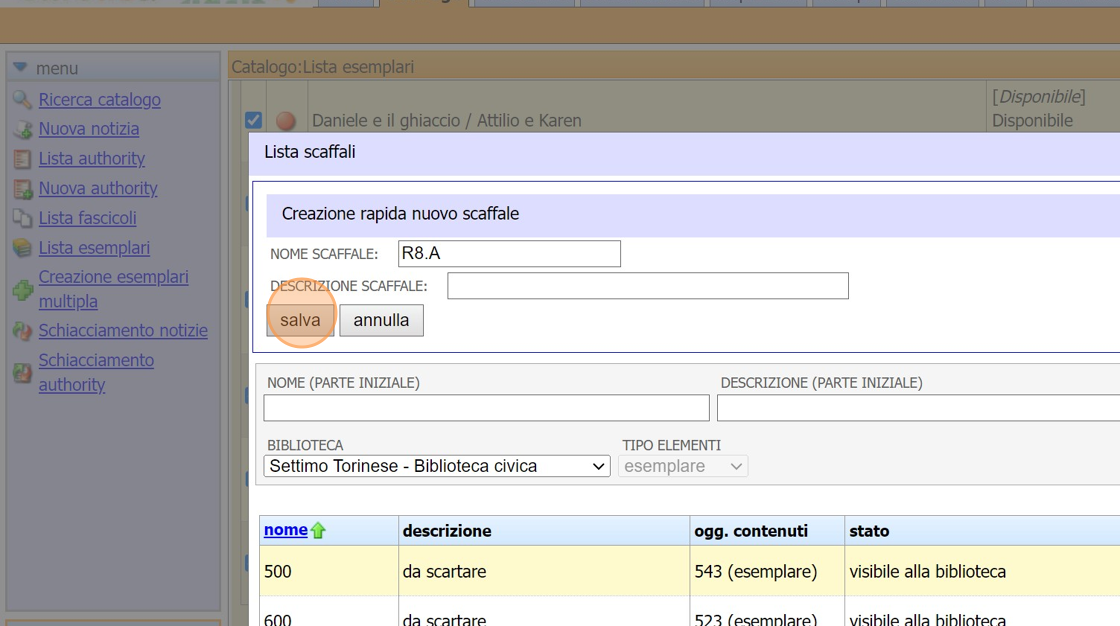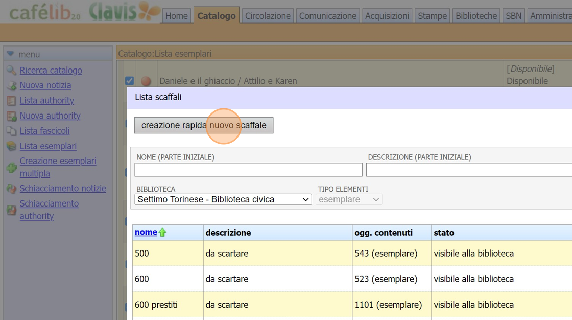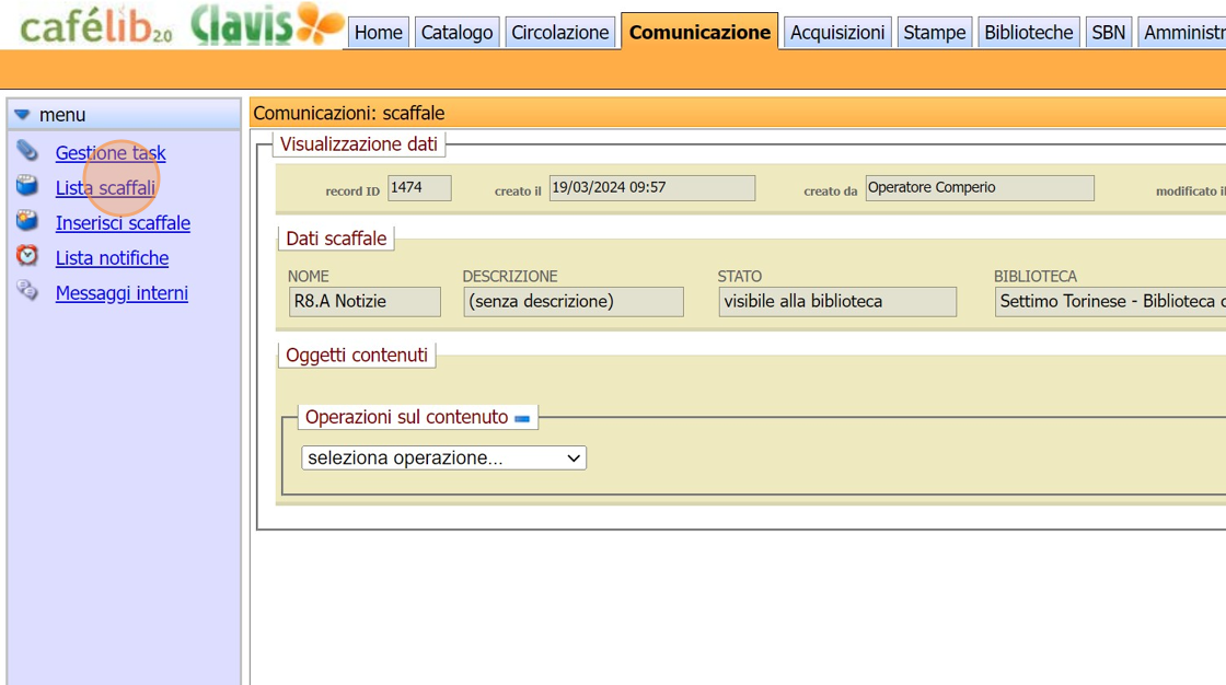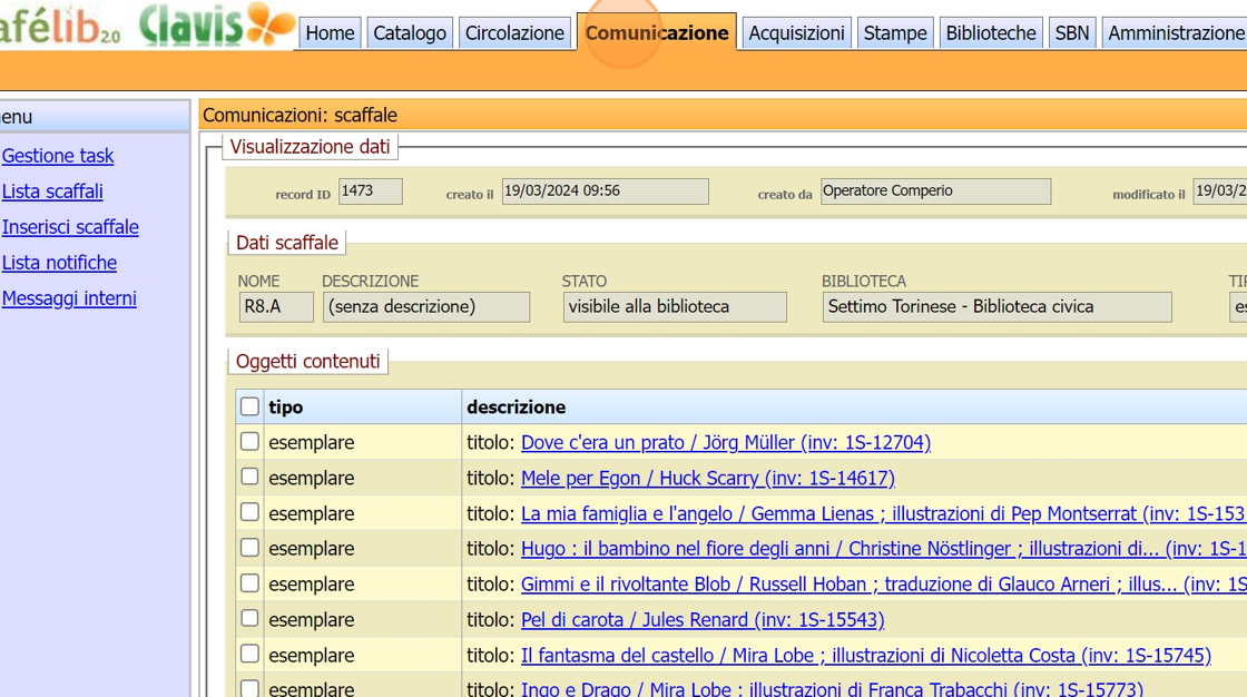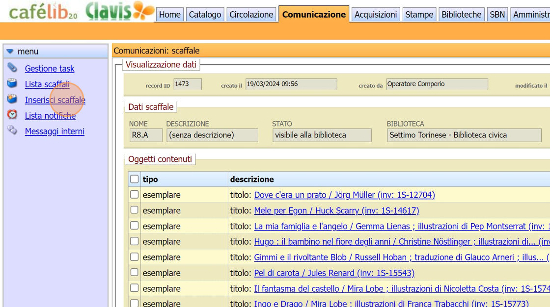 16. Individua il primo scaffale creato, quello con il titolo uguale al valore della ricerca senza la parola Notizie (controlla che nella colonna ogg. contenuti ci sia scritto esemplare tra parentesi)*