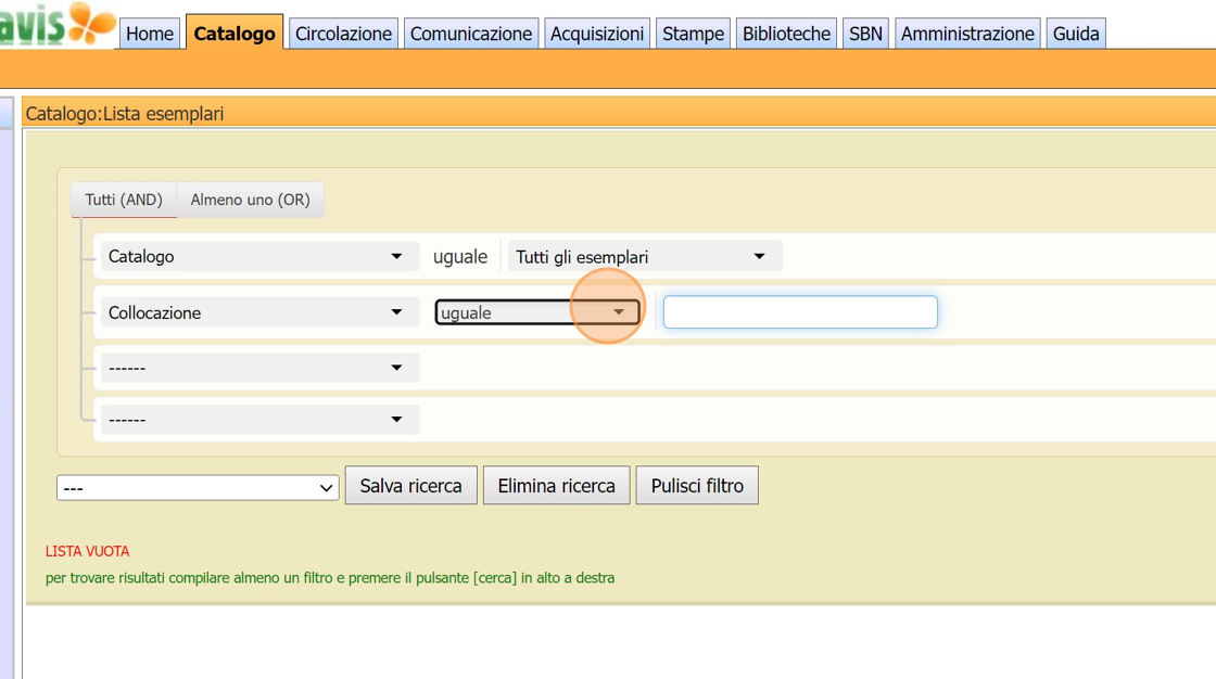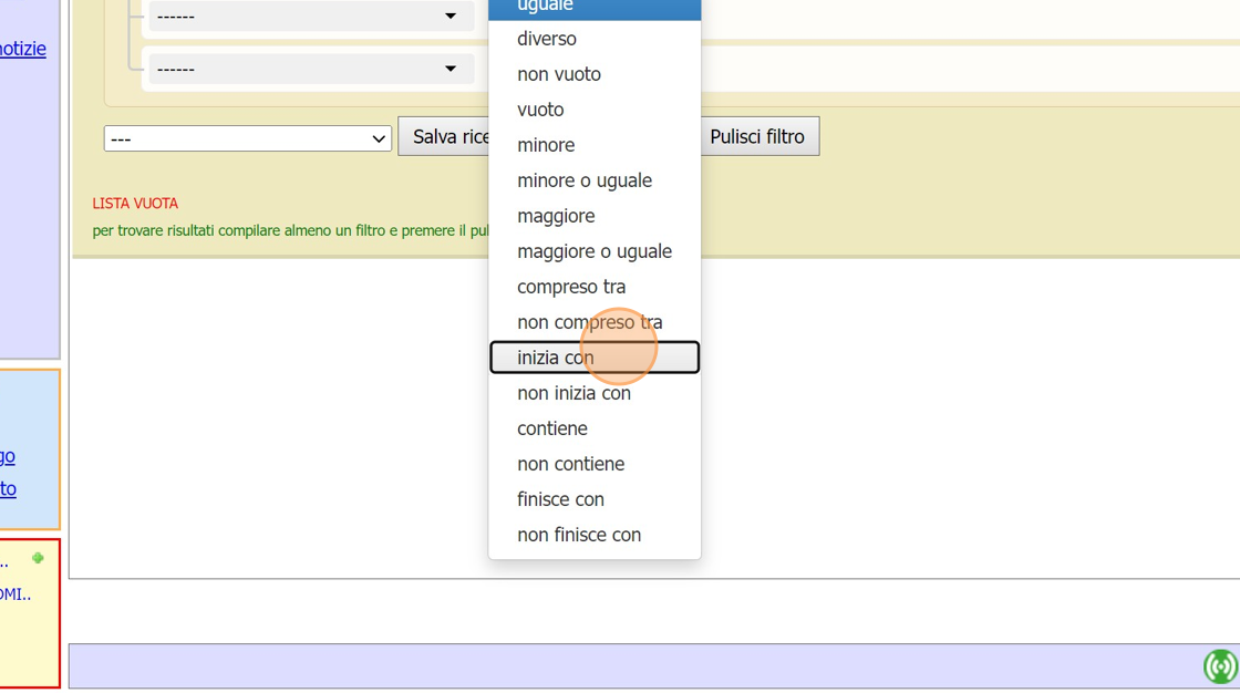 5. Seleziona la modalità di ricerca del valore del filtro (es. "inizia con")