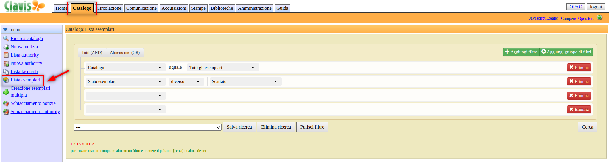 Nella pagina Lista esemplari si possono effettuare ricerche semplici o complesse sul patrimonio, al fine di individuare esemplari per le attività di gestione o di prestito.