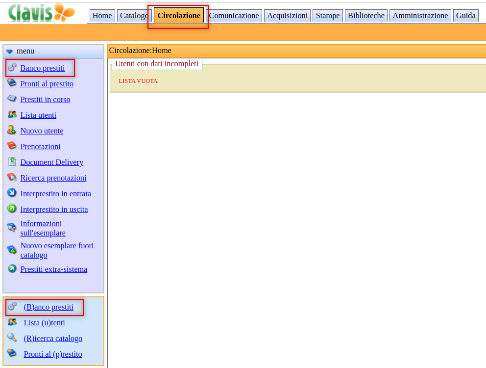 Per fare un prestito è necessario andare alla pagina Banco prestiti, raggiungibile dalla sezione Circolazione o dal menu scorciatoia visibile in tutte le pagine di Clavis.