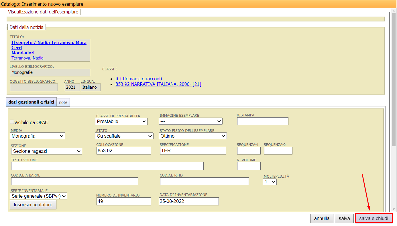 inserire i dati gestionali e fisici: cliccando Inserisci contatore il sistema assegna automaticamente un numero di inventario all’esemplare, deve però essere presente una serie inventariale. Dopo aver inserito i dati cliccare salva e chiudi.