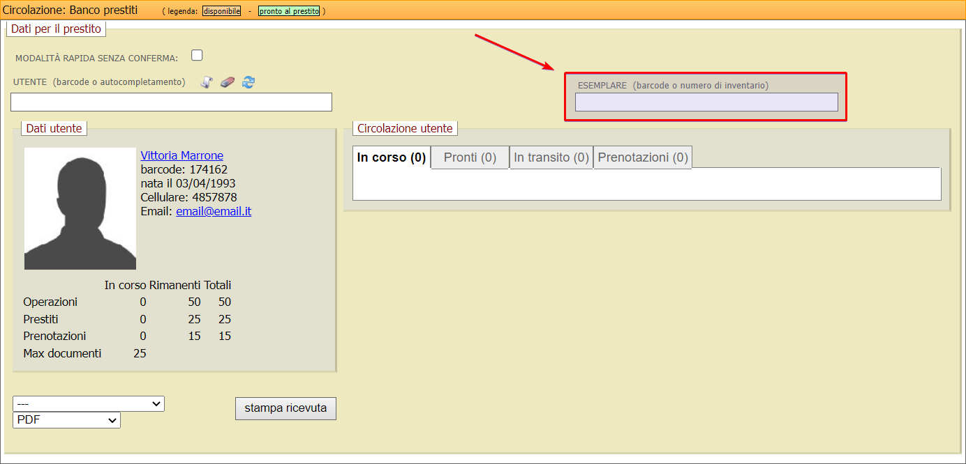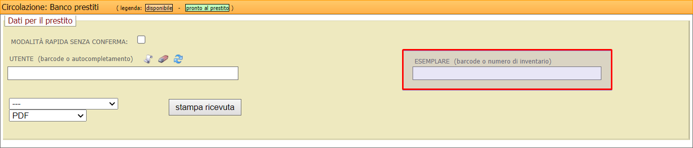 Il Banco prestiti è costituito dai due campi di inserimento Utente ed Esemplare: