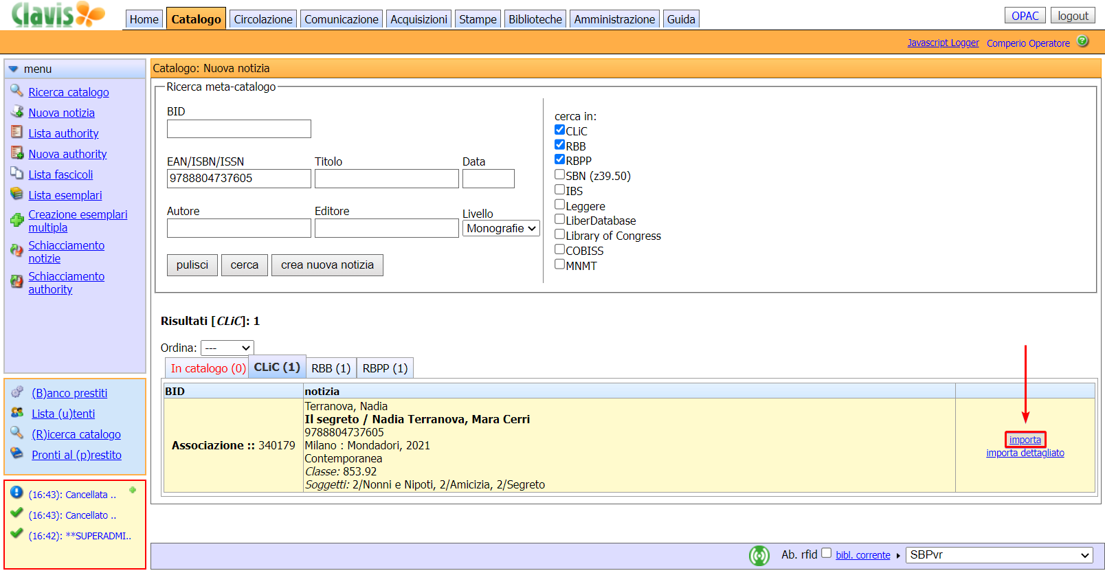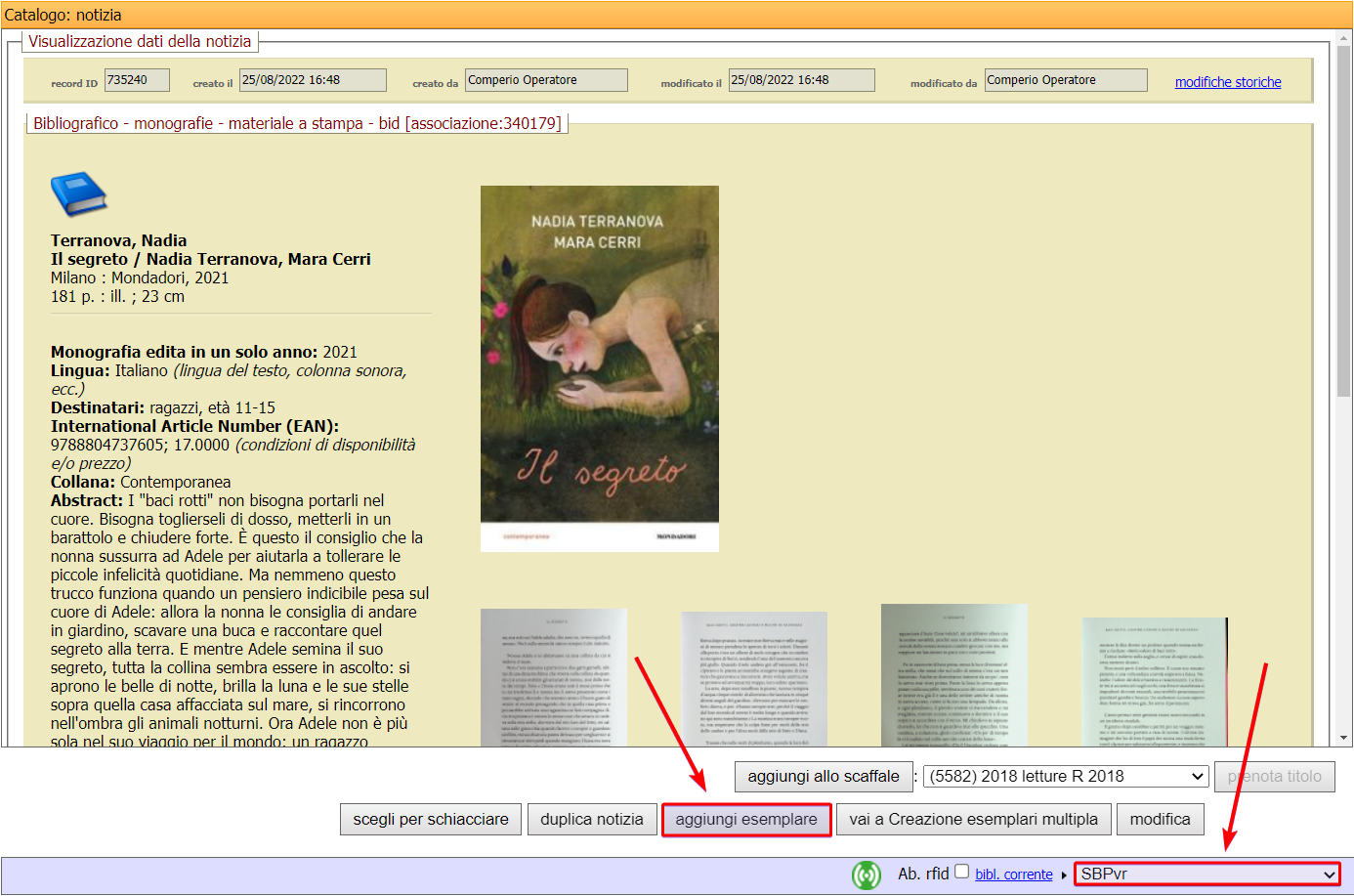 dopo aver visualizzato i dati della notizia, cliccare in basso aggiungi esemplare (l’esemplare verrà aggiunto nella biblioteca in cui si è loggati, visibile in basso a destra)