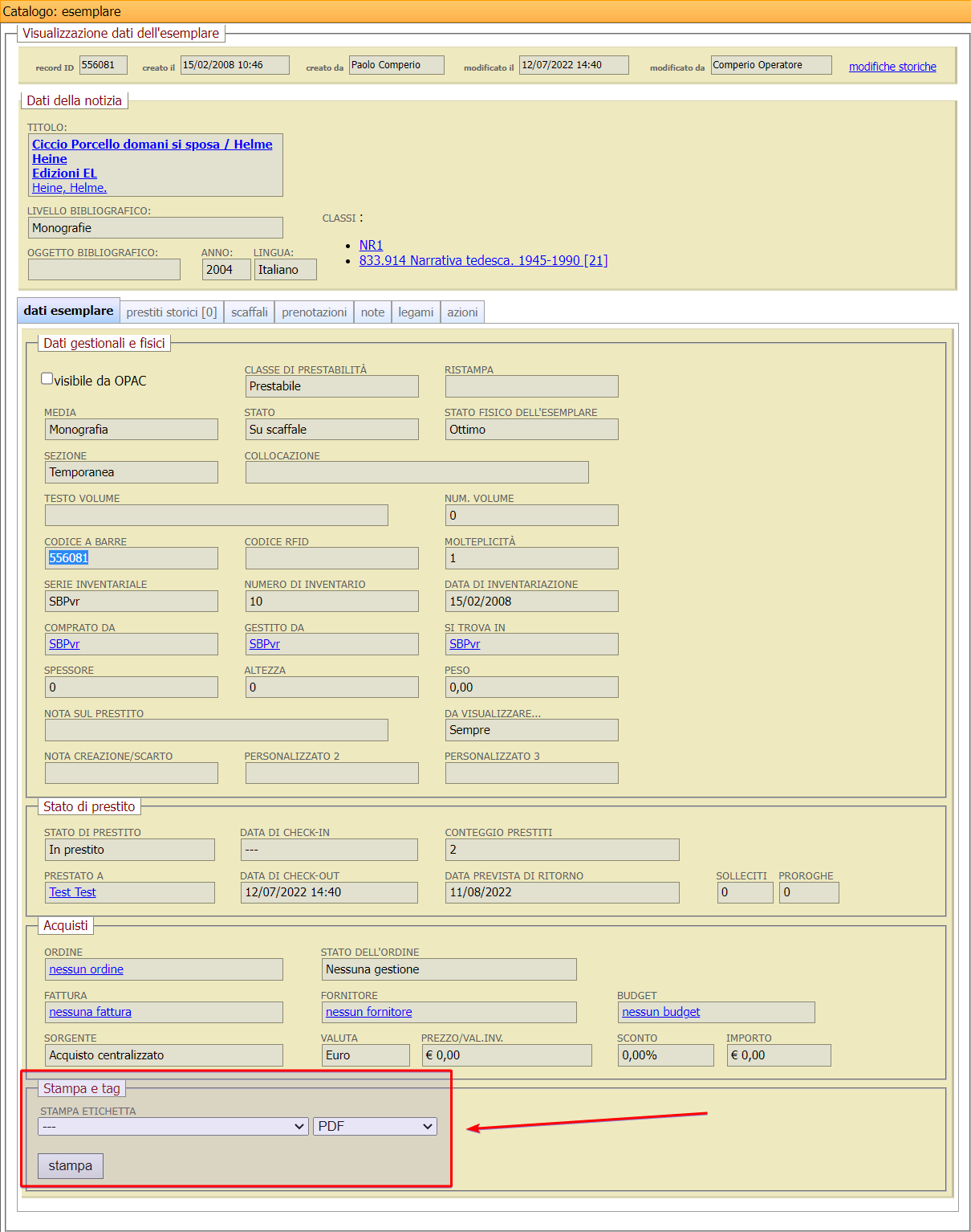Nella scheda dell’esemplare, in fondo alla pagina, è visibile la sezione dedicata alla stampa dell’etichetta.
