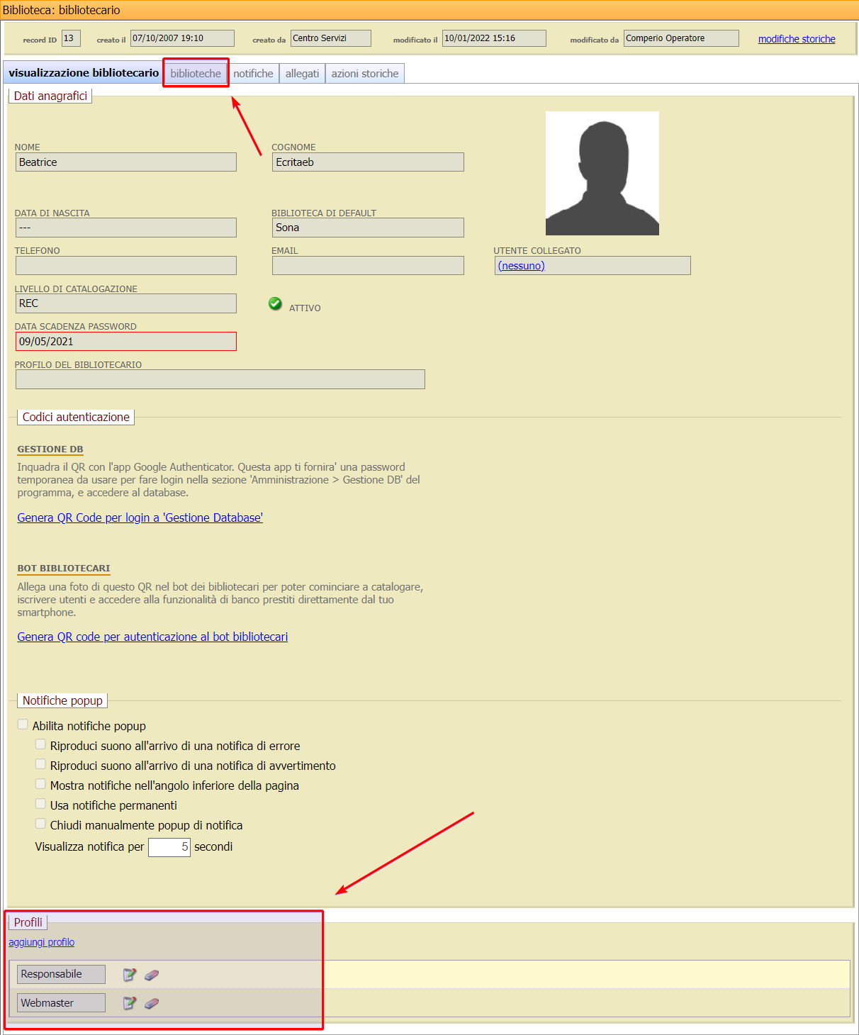 l’operatore della biblioteca (bibliotecario, catalogatore, volontario ecc.), che viene creato dal responsabile.