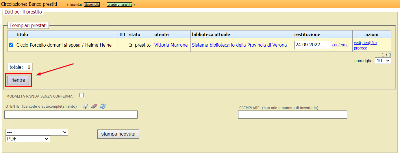 In alternativa è possibile cliccare l’azione Rientra dall'area dei Prestiti in corso pre-selezionando l’utente.